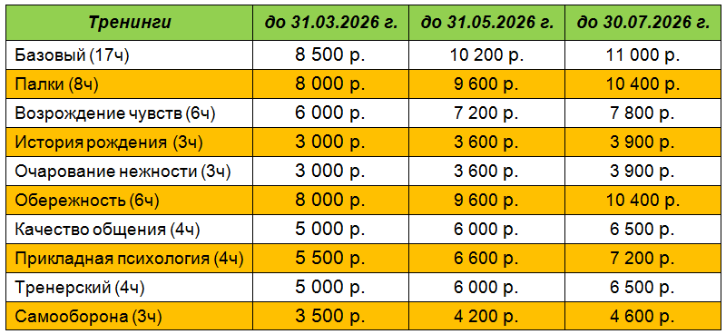 2. Парам, пенсионерам, многодетным и студентам в размере 10% со стоимости тренингов (с другими скидками не суммируется);