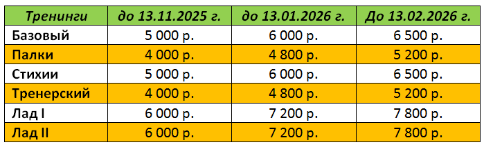 2. Парам, пенсионерам, многодетным и студентам в размере 10% со стоимости тренингов (с другими скидками не суммируется);